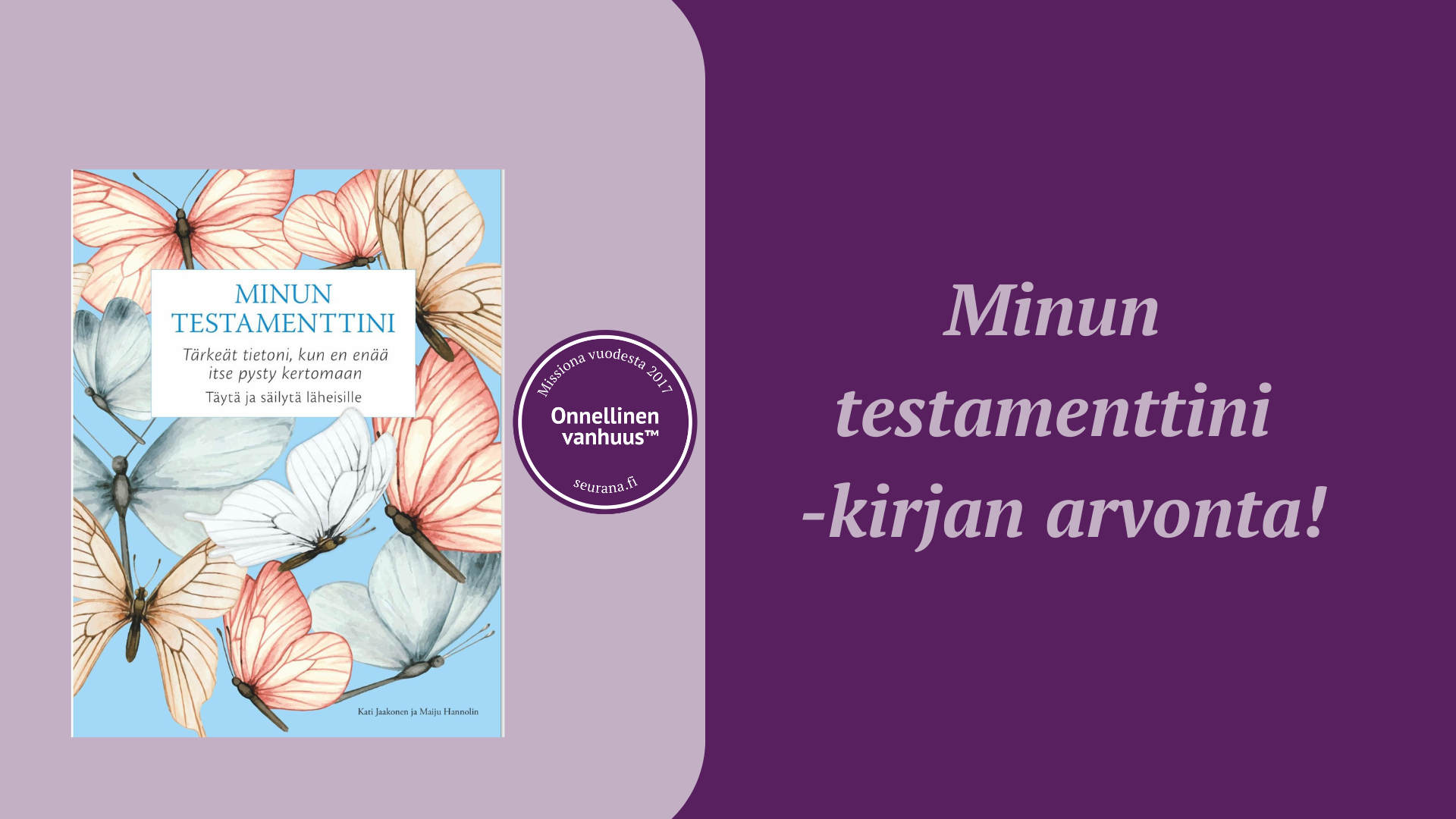 Kuinka voi osallistua arvontaan: Arvontaan osallistuvat kaikki kilpailulomakkeen täyttäneet henkilöt. - Osallistuminen arvontaan: Kilpailuun osallistujien kesken arvontaan yksi (1) Minun testamenttini -kirja. Palkinto arvotaan kampanja-ajan päätyttyä. Palkintoa ei makseta rahana eikä sitä voi vaihtaa muuhun tuotteeseen.
